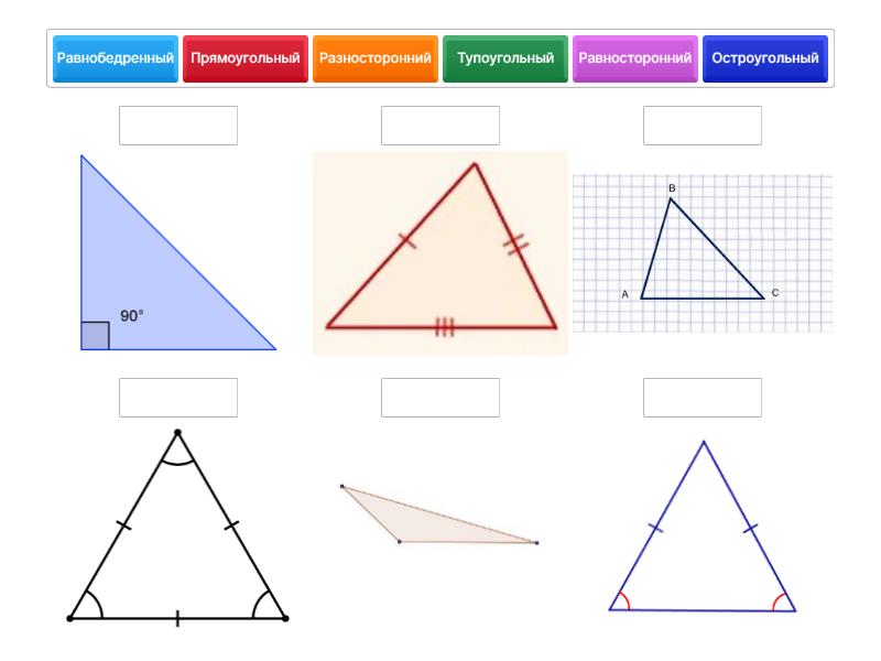 Равносторонний, Равнобедренный, Разносторонний, Прямоугольный, Остроугольный, Тупоугольный,