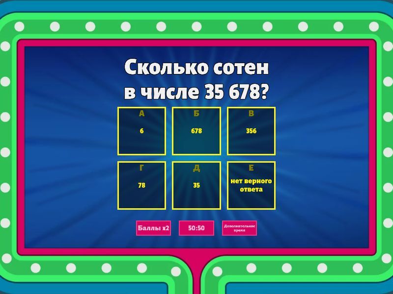 1) Сколько сотен в числе 35 678? a) 6 b) 678 c) 356 d) 78 e) 35 f) нет верного ответа 2) Сколько всего десятков в числе 1392? a) 2 b) 9 c) 3 d) 1 e) 139 f) все верно 3) Чему равна сумма чисел 570 и 430? a) 100 b) 1000 c) 950 d) 1100 e) 1010 f) 1200 4) Чему равна разность чисел 730 и 470? a) 360 b) 240 c) 260 d) 1200 e) 1000 f) 310 5) Во сколько раз 770 больше 11? a) 10 b) 12 c) 14 d) 70 e) 77 f) 17 6) Во сколько раз 3 меньше, чем 870? a) 29 b) 30 c) 290 d) 15 e) 20 f) 25 7) Какое число умножили на 40 и получили 2400? a) 6 b) 24 c) 240 d) 65 e) 60 f) 160 8) Какое число составляет 1/3 от числа 360? a) 1080 b) 357 c) 263 d) 12 e) 100 f) 120 9) Сколько центнеров в 12 т? a) 120 b) 1 200 c) 12 000 d) 120 000 10) В магазине было 600 рулонов обоев. Продали 1/10 часть всех рулонов. Сколько рулонов осталось в магазине? a) 60 b) 660 c) 540 d) 640 e) 500