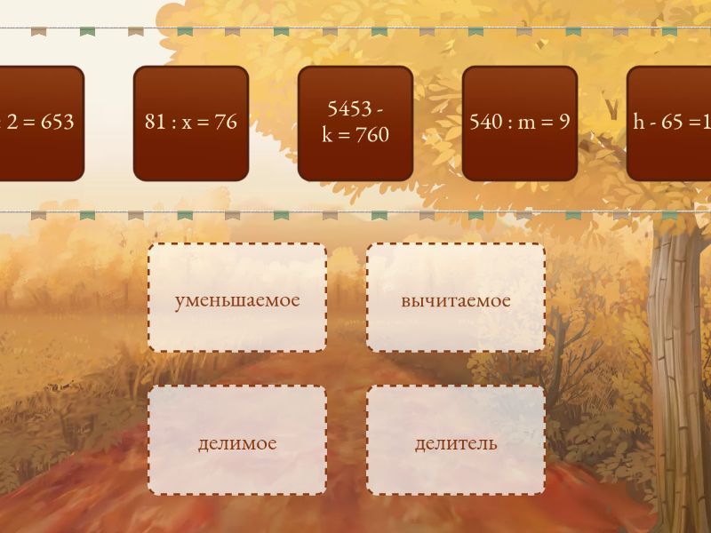 уменьшаемое: x - 87 = 129, h - 65 =162, y - 43 = 364, m - 61 = 543, вычитаемое: 6532 - y = 585, 805 - x = 657, 9822 - m = 6561, 1444 - h = 54, 5453 - k = 760, делимое: m : 76 = 9, x : 86 = 4, h : 2 = 653, делитель: 540 : m = 9, 9346 : y = 2, 843 : k = 3, 81 : x = 76,