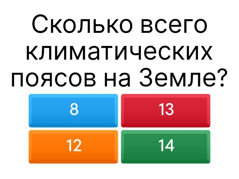 1) Сколько всего климатических поясов на Земле? a) 8 b) 13 c) 12 d) 14 2) Какой пояс относится к переходным a) экваториальный b) тропический c) субтропический d) умеренный 3) Какой пояс расположен в Гренландии и Северном Ледовитом океане a) арктический b) антарктический c) умеренный d) тропический 4) Для какого пояса подходят характеристики - теплый и влажный a) умеренный b) арктический c) тропический d) экваториальный 5) Для какого пояса подходят характеристики - холодные и сухие a) умеренный b) тропический c) арктический d) экваториальный 6) Для какого пояса подходят характеристики - теплый и сухой, формируются пустыни a) умеренный b) тропический c) арктический d) экваториальный 7) Для какого пояса подходят характеристики - формируются четыре сезона года a) умеренный b) тропический c) экваториальный d) арктический 8) Пояс, где господствуют летом экваториальные воздушные массы, а зимой - тропические воздушные массы a) субарктический пояс b) арктический пояс c) субэкваториальный пояс d) субтропический пояс 9) Летний муссон дует a) с океана на материк b) с материка на океан c) с материка на остров d) с океана в гору