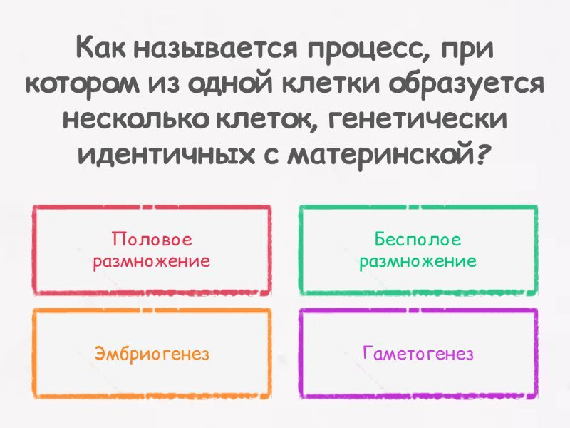 1) Как называется процесс, при котором из одной клетки образуется несколько клеток, генетически идентичных с материнской? a) Половое размножение b) Бесполое размножение c) Эмбриогенез d) Гаметогенез 2) Какой процесс характеризуется слиянием гамет и образованием зиготы? a) Оплодотворение b) Эмбриогенез c) Гаметогенез d) Мейоз 3) Какие существуют основные способы бесполого размножения? a) Простое деление (деление надвое) b) Почкование 4) Какие существуют основные способы бесполого размножения? a) Деление надвое, почкование, фрагментация b) Оплодотворение и клональность c) Гаметогенез и эмбриогенез d) Партеногенез и спорация 5) Что такое гаметы и какие функции они выполняют в процессе размножения? a) Клетки иммунной защиты b) Клетки, отвечающие за регенерацию тканей c) Клетки, участвующие в росте и развитии организма d) Специализированные клетки для передачи наследственной информации