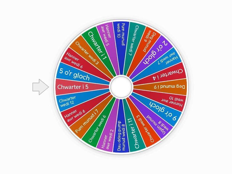 1) 5 o'r gloch 2) Hanner awr wedi 6 3) Chwarter wedi 3 4) Chwarter i 1 5) Hanner awr wedi 5 6) Pum munud wedi 10 7) Chwarter wedi 7 8) Deg munud wedi 9 9) 2 o'r gloch 10) Hanner awr wedi 7 11) Chwarter i 4 12) Deg munud i 9 13) Hanner awr wedi 10 14) 9 o'r gloch 15) Ugain munud wedi 8 16) Chwarter wedi 3 17) Chwarter i 11 18) Dau ddeg pump munud wedi 8 19) Hanner awr wedi 2 20) Chwarter wedi 6 21) Pum munud i 7 22) Hanner awr wedi 6 23) Chwarter wedi 12 24) Chwarter i 5