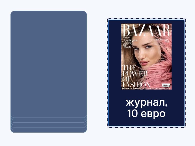 журнал, 10 евро, билет на автобус, 3 евро, билет на метро, 5 евро, билет на самолёт, 100 евро, билет в кино, 15 евро, билет на поезд, 68 евро, билет на паром, 49 евро, велосипед, 199 евро.