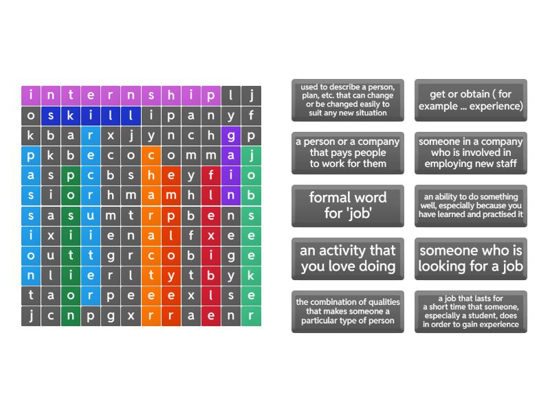 recruiter - someone in a company who is involved in employing new staff, flexible - used to describe a person, plan, etc. that can change or be changed easily to suit any new situation, character - the combination of qualities that makes someone a particular type of person, position - formal word for 'job', internship - a job that lasts for a short time that someone, especially a student, does in order to gain experience, skill - an ability to do something well, especially because you have learned and practised it, jobseeker - someone who is looking for a job, employer - a person or a company that pays people to work for them, gain - get or obtain ( for example ... experience), passion - an activity that you love doing,