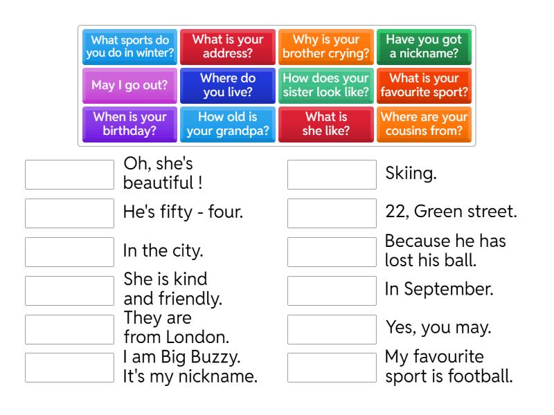 What is your favourite sport? - My favourite sport is football., What sports do you do in winter? - Skiing., May I go out? - Yes, you may., Have you got a nickname? - I am Big Buzzy. It's my nickname., Where do you live? - In the city., How does your sister look like? - Oh, she's beautiful !, When is your birthday? - In September., How old is your grandpa? - He's fifty - four., What is she like? - She is kind and friendly., What is your address? - 22, Green street., Where are your cousins from?  - They are from London., Why is your brother crying? - Because he has lost his ball.,