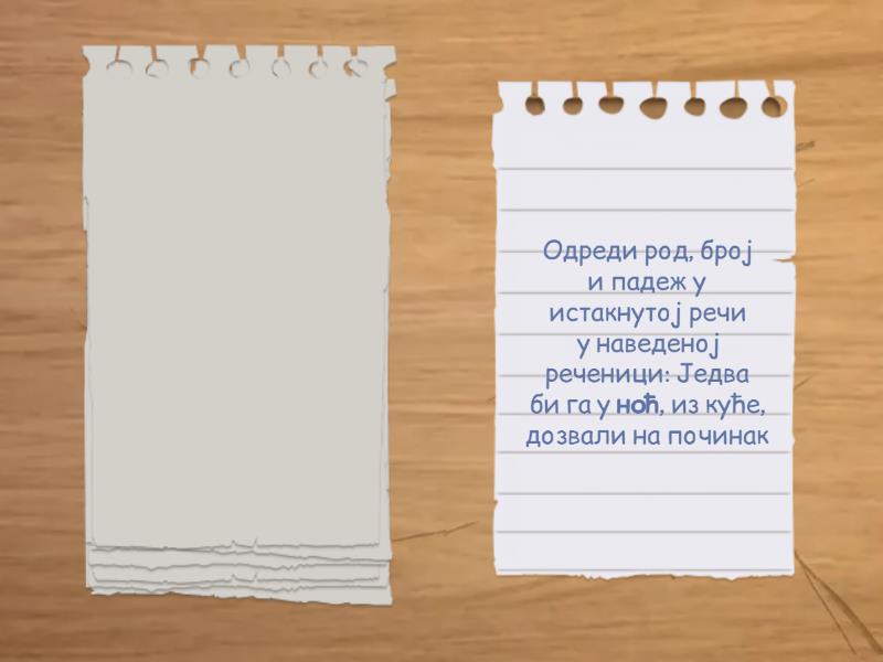 Одреди падеж у истакнутој речи: Бог те благословио, сине - одговорио је отац., Одреди род, број и падеж у истакнутој речи у наведеној реченици: Једва би га у ноћ, из куће, дозвали на починак, Одреди падеж и број истакнутих речи у примерима: Јали грми, јал' се земља тресе? Не бојте се, браћо моја драга! Што доведе к нама Радојицу? Хоће ли нас поморити смрадом?, Одреди којим врстама речи припадају истакнуте речи у наведеној реченици: Да још једног Обилића имам у војсци, мирније бих уочи Косова спавао!, Одреди граматички род истакнуте именице у одломку из Боја на Косову: И ви, браћо Стеване и Лазаре Мусићу, и ви, Топлицо Милане и Косанчић Иване., У следећој реченици издвој градивну именицу: Много ме је мучила жеља да ту сиђем и испем се на врх Авале, близу Београда, и одатле поздравим јуначку Србију, као што сам са врха снегом покривеног Титлиса поздравио херојску Швајцарску., Одреди род, број и падеж истакнутих речи: Велика зграда саграђена је на Новом Београду.. .