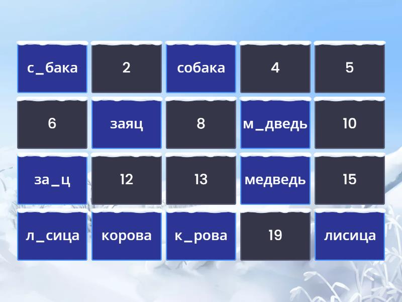 лисица - л_сица, собака - с_бака, заяц - за_ц, корова - к_рова, медведь - м_дведь, молоко - м_л_ко, воробей - в_р_бей, ворона - в_рона, сорока - с_рока, петух - п_тух,