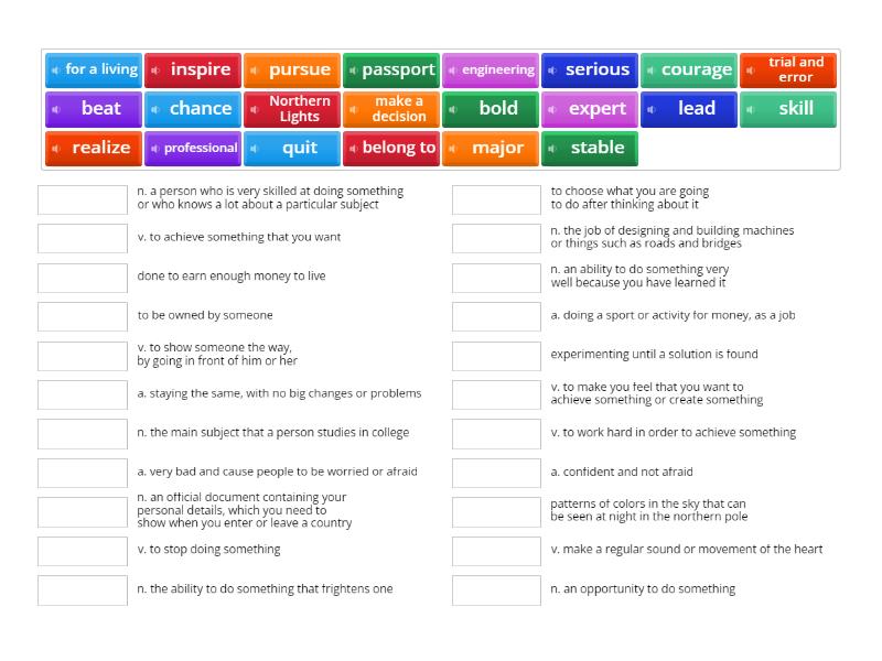 major - n. the main subject that a person studies in college, stable - a. staying the same, with no big changes or problems, quit - v. to stop doing something , professional - a. doing a sport or activity for money, as a job, courage - n. the ability to do something that frightens one, pursue - v. to work hard in order to achieve something, engineering - n. the job of designing and building machines or things such as roads and bridges, skill - n. an ability to do something very well because you have learned it , inspire - v. to make you feel that you want to achieve something or create something, realize - v. to achieve something that you want, lead - v. to show someone the way, by going in front of him or her, beat - v. make a regular sound or movement of the heart, Northern Lights - patterns of colors in the sky that can be seen at night in the northern pole, trial and error - experimenting until a solution is found, bold - a. confident and not afraid , for a living - done to earn enough money to live, chance - n. an opportunity to do something , make a decision - to choose what you are going to do after thinking about it, belong to - to be owned by someone, passport - n. an official document containing your personal details, which you need to show when you enter or leave a country, serious - a. very bad and cause people to be worried or afraid, expert - n. a person who is very skilled at doing something or who knows a lot about a particular subject,