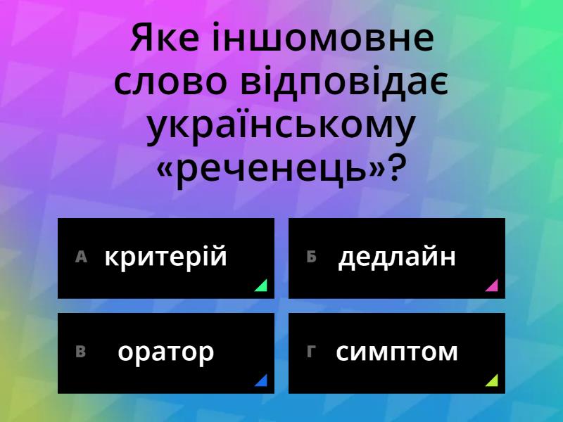 1) Яке іншомовне слово відповідає українському «реченець»? a) критерій b) дедлайн c) оратор d) симптом 2) Фразеологізм «давати на горіхи» означає a) сварити b) хвалити c) виявляти щедрість d) відмовляти 3) «Цвенькати, хамаркати, варнякати» — це нюансові синоніми до слова a) йти b) бити c) їсти d) говорити 4) Як правильно просити вибачення? a) вибачте мене b) вибачте мені c) вибачаюся d) приношу вибачення 5) Початок української літературної мови ведуть з дати видання a) «Букваря» Івана Федорова b) «Кобзаря» Тараса Шевченка c) «Енеїди» Івана Котляревського d) «Граматики» Мелетія Смотрицького 6) У якому слові наголос падає на третій склад? a) горошина b) отаман c) довідник d) одноразовий 7) Що означає діалектне слово «тремпель»? a) вішак для одягу b) молоток c) кухоль d) велосипед 8) День української писемності та мови святкують 27 жовтня (раніше 9 листопада), цього дня відбувається щорічний a) мистецький фестиваль «Ї» b) Диктант національної єдності c) мовомарафон «Переходь на українську» d) флешмоб «5 улюблених українських слів» 9) Дієслівна форма «читав був» — це a) давноминулий час b) діалектизм c) просторіччя d) граматична помилка 10) Якій літері української абетки в м.Рівному встановили пам'ятний знак заввишки понад 3 метри? a) ґ b) і c) ї d) у 11) У новій редакції українського правопису від 2019 року НЕМАЄ такого нововведення: a) утворення фемінітивів b) вживання букви И в слові «индик» c) паралельні закінчення «незалежності» й «незалежности» d) заміна Е на Є в слові «проєкт» 12) Згідно з дослідженнями у 2020-2023 роках вживання української мови в соціальних мережах значно зросло, а найбільший % контенту українською в a) фейсбуці b) інстаграмі c) твіттері d) ютубі