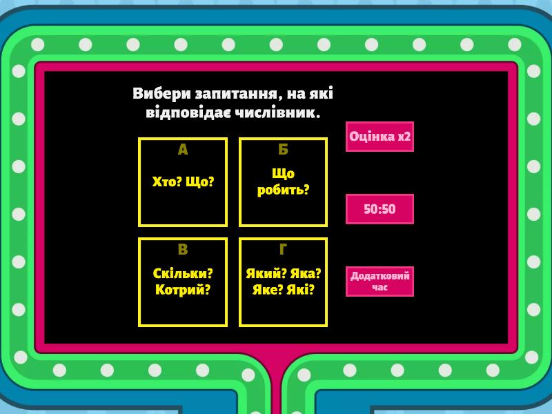1) Вибери запитання, на які відповідає числівник. a) Хто? Що? b) Що робить? c) Скільки? Котрий? d) Який? Яка? Яке? Які? 2) Підбери числівник у речення: "Мама купила ... пиріжки". a) четверо b) четвертий c) чотьрьох d) чотири 3) Як правильно записати числівник "16" словами? a) Шіснадцять b) Шістнадцять c) Шістьнадцять d) Шістнацять 4) Вибери серед поданих простий числівник. a) Дев'ять b) Сімнадцять c) Двадцять два d) Дев'яносто 5) Вибери серед поданих складений числівник. a) Вісім b) Одинадцять c) Сорок d) Сорок два 6) Як правильно записати числівник "53" словами? a) П'ятдисят три b) Пядесят три c) П'ятдесят три d) П'ядесят три 7) Який числівник вставимо у речення: "Бабуся купила ... яблук." ? a) Восьме b) Вісім c) Восьмеро d) Вісьми 8) У якому числівнику потрібно писати апостроф? a) 19 b) 16 c) 36 d) 8 9) Як правильно? a) До трьох плюс чотири дорівнює сім. b) До трьох додати чотири буде шість. c) Три додати чотири буде сім. d) Три плюс чотири дорівнює сім. 10) Встав числівник у речення: "О ... годині ранку я снідаю" a) восьмі b) восьмій c) вісім d) восьма 11) Який числівник простий? a) Чотири b) Дванадцять c) Чотириста d) Сто два 12) Яке словосполучення вжите правильно? a) Сім хліба b) Три апельсини c) Сто книга d) Двадцять метри