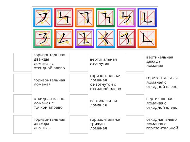 горизонтальная ломаная, вертикальная ломаная, горизонтальная ломаная с откидной влево, откидная влево ломаная с горизонтальной , откидная влево ломаная с точкой вправо, горизонтальная дважды ломаная с откидной влево, горизонтальная ломаная с изогнутой с откидной влево, вертикальная дважды ломаная, вертикальная ломаная с откидной влево, горизонтальная дважды ломаная, горизонтальная трижды ломаная , вертикальная изогнутая,