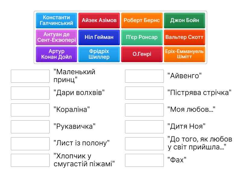 Джон Бойн - "Хлопчик у смугастій піжамі", Фрідріх Шиллер - "Рукавичка", Вальтер Скотт - "Айвенго", Еріх-Еммануель Шмітт - "Дитя Ноя", Антуан де Сент-Екзюпері - "Маленький принц", Константи Галчинський - "Лист із полону", П'єр Ронсар - "До того, як любов у світ прийшла...", Роберт Бернс - "Моя любов...", Артур Конан Дойл  - "Пістрява стрічка", О.Генрі - "Дари волхвів", Айзек Азімов - "Фах", Ніл Гейман - "Кораліна",