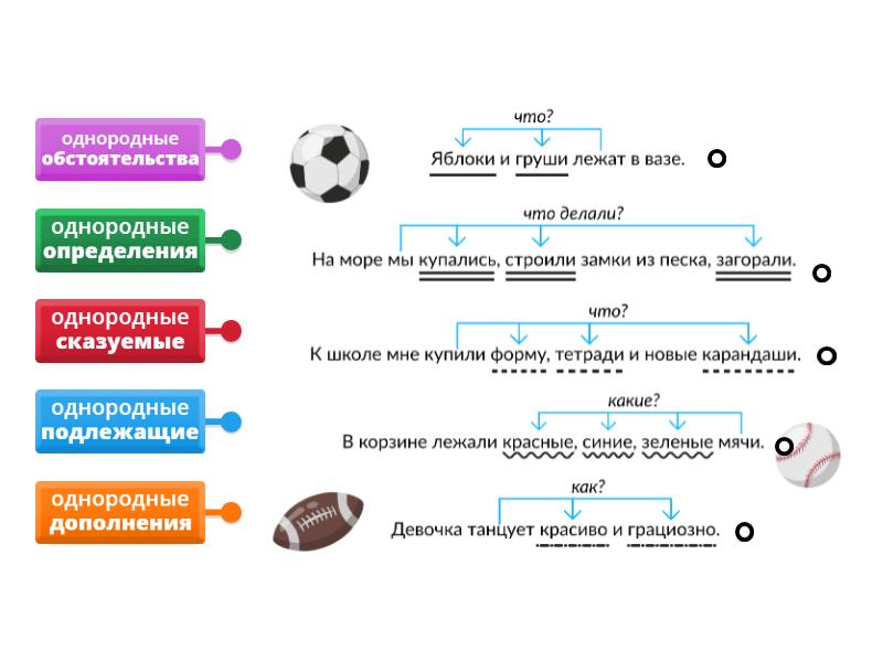 однородные подлежащие, однородные сказуемые, однородные дополнения, однородные определения, однородные обстоятельства.