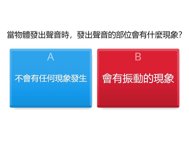 1) 當物體發出聲音時,發出聲音的部位會有什麼現象? a) 不會有任何現象發生 b) 會有振動的現象 2) 當振動停止,聲音會產生什麼變化? a) 聲音也就消失了 b) 物體會繼續發出聲音 3) 聲音只能透過空氣傳播嗎? a) 是 b) 否 4) 聲音可以透過物質傳播? a) 是 b) 否 5) 聲音可以透過哪些物質傳播? a) 固體 b) 液體 c) 氣體 d) 真空 e) 快太空