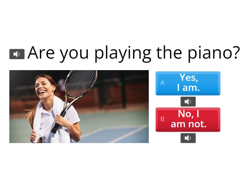 1) Are you playing the piano? a) Yes, I am. b) No, I am not. 2) Is he playing football? a) Yes, he is. b) No, he is not. 3) Are they playing tennis? a) Yes, they are. b) No, they are not. 4) Are we studing English? a) Yes, we are. b) No, we are not. 5) Is she reading a book? a) Yes, she is. b) No, she is not. 6) Is he writing? a) Yes, he is. b) No, he isn't. 7) Are they cooking? a) Yes, they are. b) No, they aren't. 8) Are they watching TV? a) Yes, they are. b) No, they aren't. 9) Am I playing board games? a) Yes, I'm. b) No, I'm not.