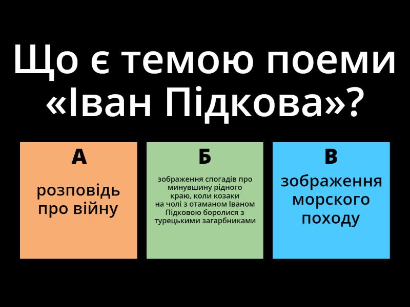 1) Що є темою поеми «Іван Підкова»? a) розповідь про війну b) зображення спогадів про минувшину рідного краю, коли козаки на чолі з отаманом Іваном Підковою боролися з турецькими загарбниками c) зображення морского походу 2) Про що згадує автор на початку твору? a) щасливе життя українців до війни b) сміливість і мужність запорожців c) власне дитинство 3) Могили, де поховані оборонці рідної землі: a) зберігають славну минувшину b) поросли травою і всіма забуті c) уквітчуються до свят 4) Про який похід Івана Підкови розповідається в поемі? a) морський b) сухопутний c) облога ворожого міста 5) Яку пісню співали козаки, перебуваючи на байдаках? a) «Віють вітри, віють буйні» b) «Як були ми козаками…» c) «Грай же, море!» 6) Яку звання в поемі має Іван Підкова? a) сотник b) отаман c) полковник 7) Що в поемі Іван Підкова називає «роботою»? a) бій з ворогом b) ремонт човнів c) приготування зброї до бою 8) Який засіб художньої виразності вжито в рядках: «Тече вода в синє море, та не витікає; шука козак свою долю, а долі немає»? a) епітет b) метафора c) паралелізм 9) Який засіб художньої виразності вжито в рядках: «Могили… як гори», «хвилі, як ті гори»? a) порівняння b) епітет c) метафора 10) Який засіб художньої виразності вжито в рядках: «Мовчать гори, грає море, могили сумують»? a) гіпербола b) метафора c) епітети 11) Зі скількох частин складається поема? a) 1 b) 2 c) 3 12) У своїх творах Т. Г. Шевченко хотів розбудити у народу приспану ... a) козацьку волю b) відвагу c) національну свідомість