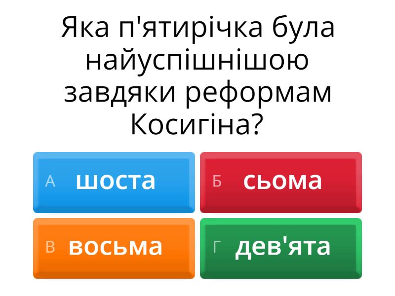1) Яка п'ятирічка була найуспішнішою завдяки реформам Косигіна? a) шоста b) сьома c) восьма d) дев'ята 2) Що означає термін «стагнація»? a) Економічне зростання b) Відсутність розвитку c) Скорочення робочих місць d) Інфляція 3) Що стало головним джерелом доходів СРСР у 1970-х роках? a) Виробництво автомобілів b) Виробництво зброї c) Виробництво сільськогосподарської продукції d) Видобуток нафти і газу 4) У якому році було введено в експлуатацію перший енергоблок Чорнобильської АЕС? a) 1969 р b) 1980 р c) 1977 р d) 1985 р. 5) Яка програма була запроваджена у 1982 році для забезпечення продовольчої незалежності СРСР? a) Програма індустріалізації b) Продовольча програма c) Продовольча програма СРСР d) Програма будівництва АЕС 6) Яка проблема особливо вплинула на економіку СРСР у 1980-х роках? a) Падіння цін на нафту b) Дефіцит робочої сили c) Збільшення виробництва зброї d) Підвищення заробітної плати 7) Що призвело до створення довгих черг у СРСР у 1970-1980-х роках? a) Велика кількість магазинів b) Збільшення кількості товарів c) Дефіцит споживчих товарів d) Високі ціни на товари