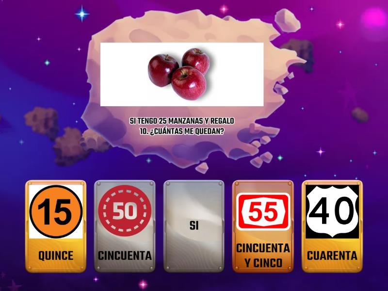 QUINCE - SI TENGO 25 MANZANAS Y REGALO 10. ¿CUÁNTAS ME QUEDAN?, CINCUENTA - SI COMPRO UN ALFAJOR A $20 Y UNA GASEOSA A $30 ¿CUÁNTO GASTÉ?, CINCUENTA Y CINCO - EN UN ALBÚM DE FIGURITAS TENGO PEGADAS 35, SI PEGO 20 MÁS ¿CUÁNTAS TENGO PEGADAS EN TOTAL?, CUARENTA - ANDREA TENÍA 50 GLOBOS. 10 LOS INFLÓ. ¿CUÁNTOS LE QUEDARON SIN INFLAR?, SI - JUAN COMPRÓ UN AUTITO DE JUGUETE A $50 Y UNA MUÑECA PARA SU HERMANA DE $40. ¿LE ALCANZÓ CON $100?,
