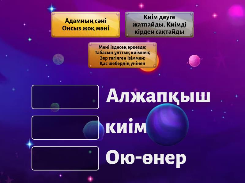 Адамның сәні Онсыз жоқ мәні - киім, Мені іздесең әркезде; Табасың ұлттық киімнен; Зер төгілген ізіммен; Қас шебердің үнінен - Ою-өнер, Киім деуге жатпайды. Киімді кірден сақтайды - Алжапқыш,