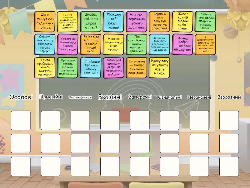 Особові: Розкажу тобі безліч казок!, В теплих снах ідуть в поля жита, і зоря над ними йде висока. , У нього не розживешся і серед зими льоду. , Присвійні: Квітка з твоєї долоні проросла у моєму серці., Спішить моє золото навздогін своєму серцю., Орільчани знають, що їхніх дівчат не переспівати. , Питально-відносні: Порічіка — червона смородина, яку здавна вважають джерелом довголіття. , Що місяцю зіроньки кажуть ясненькі?, Знаєш, скільки справ у літа?, Вказівні: Красу таку не уявити навіть в снах., Серпень того року був напрочуд спекотний., Ця річечка — Дніпра тихенька синя доня..., Заперечні: Хочеш добра — не роби нікому зла., Ніщо не підноситься вище правди., Означальні: Живе в кожній людині сокіл і сонце., Під самісіньким кущем калини — криничка., Надією і терпінням усього досягнеш. , Неозначені: У тісто прибрався, чимсь смачним напхався., Зненацька рипнули двері і на ґанок хтось вийшов. , День минув без будь-яких пригод. , Зворотний: У дзеркало річки дивилось і не могло на себе надивитися небо. , Як іде біда в гості, то із собою злидні бере.,