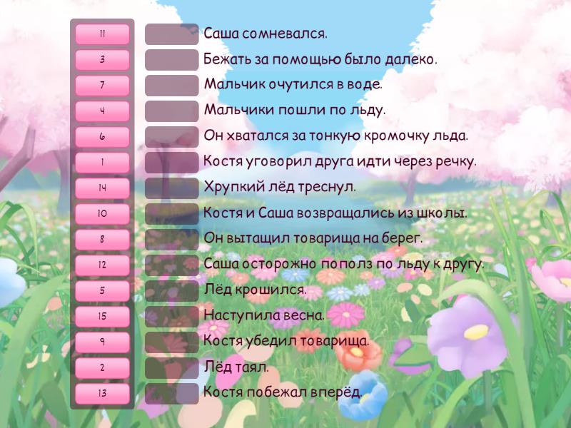 1 - Костя и Саша возвращались из школы. , 2 - Костя уговорил друга идти через речку., 3 - Саша сомневался., 4 - Наступила весна., 5 - Лёд таял., 6 - Костя убедил товарища., 7 - Мальчики пошли по льду., 8 - Костя побежал вперёд., 9 - Хрупкий лёд треснул., 10 - Мальчик очутился в воде., 11 - Он хватался за тонкую кромочку льда., 12 - Лёд крошился., 13 - Бежать за помощью было далеко., 14 - Саша осторожно пополз по льду к другу. , 15 - Он вытащил товарища на берег.,
