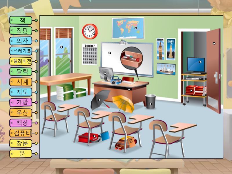 시계, 창문, 책, 의자, 가방, 컴퓨터, 텔레비전, 달력, 지도, 책상, 우산, 문, 칠판, 쓰레기통.