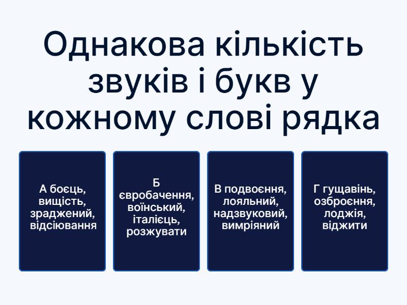 1) Однакова кількість звуків і букв у кожному слові рядка a) А боєць, вищість, зраджений, відсіювання b) Б євробачення, воїнський, італієць, розжувати c) В подвоєння, лояльний, надзвуковий, вимріяний d) Г гущавінь, озброєння, лоджія, віджити 2) Неправильну форму ступеня порівняння прикметника вжито в реченні a) А Секвоя – саме найбільше дерево на Землі. b) Б У цьому місці річка вужча. c) В Я поборю найважчі перешкоди. d) Г Заздрість – якнайогидніша з усіх емоцій 3) Спрощення приголосних на письмі відбувається в усіх словах рядка a) А балас..ний, піз..ній, гіган..ський, безсовіс..ний b) Б зап'яс..ний, зліс..ний, захис..ник, буревіс..ник c) В заздріс..ний, кіс..лявий, бороз..на, улес..ливий d) Г безвиїз..ний, пристрас..ний, чес..но, піз..но 4) М'який знак НЕ пишеться в усіх словах рядка a) А міл..ярд, ойкан..ня, мен..ший b) Б Уман..щина, Поділ..ля, піднос..ся c) В безбат..ченко, змагаєш..ся, віс..cю d) Г ін..ший, жен..шень, спіл..чанський e) Д кин..мо, ріж..мо, насип..мо 5) Прикметники з суфіксом -зьк- утворюються від усіх іменників рядка a) А Золотоноша, молодець, студент, Буг b) Б Волга, товариш, турист, черкес c) В Криворіжжя, Забужжя, Ладога, Таганрог d) Г француз, ремісник, турок, брат 6) Разом треба писати всі займенники рядка a) А аби/хто, де/котрий, будь/що, хто/небудь b) Б де/хто, чий/небудь, аби/кому, де/кому c) В де/якого, аби/кому, кому/сь, аби/чим d) Г що/небудь, де/який, будь/який, чого/небудь 7) Складносурядним є речення a) А Тонкі брови, русяві дрібні кучері, рум’яні губи – усе це дихало молодою парубоцькою красою. b) Б Здобути волю – то мій рай. c) В У дівчині пробуджується мати – творець нового життя. d) Г Як простір немислимий без руху, так поезія неможлива без думки. e) Д Гляньмо на трепетну землю – і тоді відкриється нам на зелено-голубому обличчі планети край. 8) 9. Складносурядне речення утвориться, якщо серед варіантів продовження речення «Зранку ми почали непокоїтися…» обрати a) А так що настрій зіпсувався на цілий день. b) Б бо кожен з нас почувався досить невпевнено. c) В проте погода посприяла нам і цього разу. d) Г й обговорювати можливі перешкоди. 9) Узагальнювальне слово після однорідних членів є в реченні (розділові знаки пропущено) a) А Все знайоме і рідне до болю в душі і криниця в саду і червона калина. b) Б І пісні і приказки й прислів'я все те вражало надзвичайним багатством поезії жарту гумору практичного розуму. c) В Усе прекрасне народжується зі звичайної буденності життя людська врода неперебутнє слово невмируща мелодія геніальна картина. d) Г У його слові було все злагода спокій усталеність надія. 10) Граматичну помилку допущено в реченні a) А Коли світило яскраве сонце, я вийшов з дому. b) Б Яскраве сонце засліпило мене, коли я виходив з дому. c) В Виходячи з дому, я мружився від яскравого сонця. d) ГВиходячи з дому, мене засліпило яскраве сонце. 11) Правильно утворено всі імена по батькові в рядку a) А Юрійович, Петрівна, Валерієвич b) Б В’ячеславівна, Євгенович, Кузьмич c) В Святославович, Матвійович, Ігоревна d) Г Іванівна, Іллінічна, Геннадійович 12) Апостроф ставиться у всіх словах рядка a) А сурм..яний, мавп..ячий, перед..ювілейний, торф..яний; b) Б дит…ясла, зв..ялений, медв..яний, харків..янин; c) В розв..язано, черв..як, кон..юктивіт, Х..юстон; d) Г н..юанс, моркв..яний, без..язикий, реп..ях; e) Д прем..єра, ад..ютант, Рів..єра, п..юпітр. 13) Правильно подано тлумачення фразеологізму зуби з’їсти у рядку a) А торкнутися найболючіш