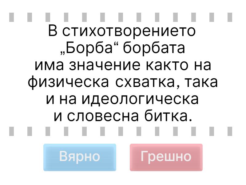 Вярно: В стихотворението „Борба“ борбата има значение както на физическа схватка, така и на идеологическа и словесна битка., Андрешко е представен като антипод на съдия-изпълнителя в социален и нравствено-етичен план., В „Андрешко“ се проявява хитрост и измама, но те са подчинени на състраданието и желанието да се помогне на слабия., В „Приказка за стълбата“ горното пространство е символ на властта и материалното, откъснато от труда и състраданието., И в трите произведения властта е критикувана като чужда на човешките страдания и социалната справедливост., Грешно: В „Борба“ на Христо Ботев негодуванието на лирическия говорител е насочено единствено срещу чуждата тирания, Властта в „Борба“ е представена като прогресивна и загрижена за народа., В „Андрешко“ съдия-изпълнителят е представен с личното си име, което го прави по-човечен., Съдия-изпълнителят демонстрира уважение към селяните, въпреки своето социално положение., В „Приказка за стълбата“ героят запазва морала си, докато изкачва стълбата на властта.,
