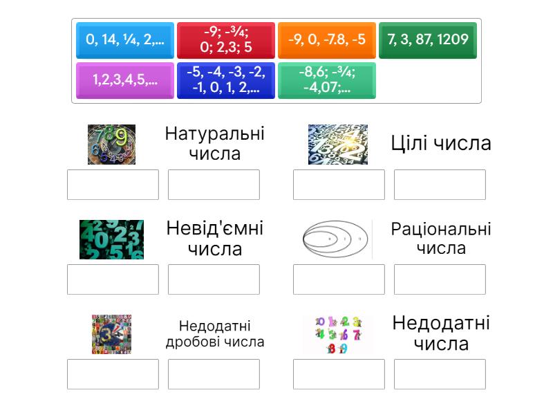 Натуральні числа: 1,2,3,4,5,..., 7, 3, 87, 1209, Цілі числа: -5, -4, -3, -2, -1, 0, 1, 2,..., Невід'ємні числа: 0, 14, ¼, 2,..., Раціональні числа: -9; -¾; 0; 2,3; 5, Недодатні дробові числа: -8,6; -¾; -4,07;..., Недодатні числа: -9, 0, -7.8, -5,