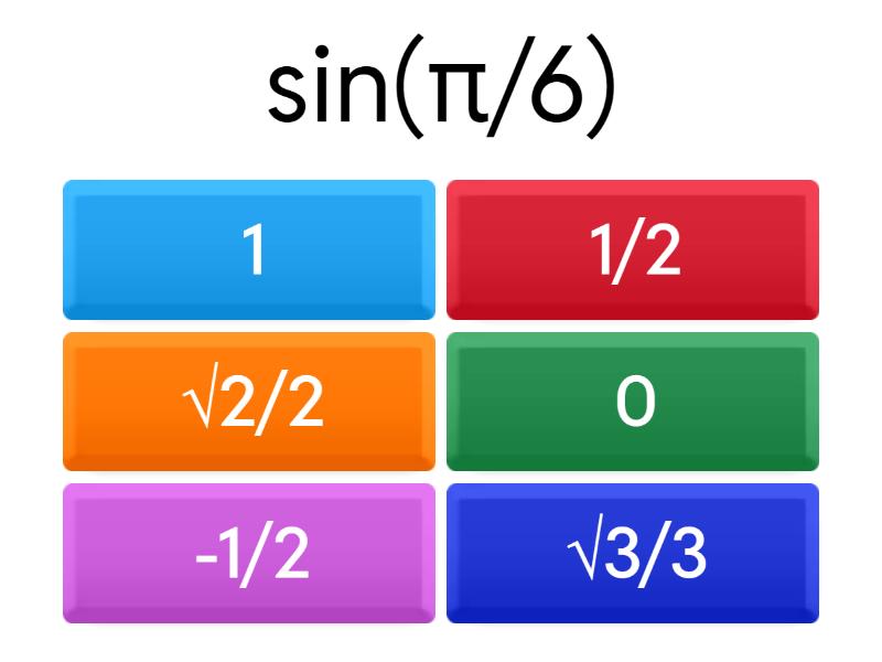 1) sin(π/6) a) 1 b) 1/2 c) √2/2 d) 0 e) -1/2 f) √3/3 2) cos(0) a) -1 b) - c) √2/2 d) 0 e) 1 f) -1/2 3) tg(π/3) a) -√3 b) 1/2 c) √3 d) √3/3 e) √3/2 f) -√3/3 4) ctg(π/4) a) √2/2 b) 1 c) 0 d) -√2/2 e) -1 f) - 5) sin(π/3) a) -√3/2 b) √3/3 c) 1/2 d) -1/2 e) -√3/3 f) √3/2 6) cos(π/6) a) √3/2 b) 1/2 c) -√3/2 d) √3/3 e) -1/2 f) √3 7) tg(π/2) a) √3/3 b) - c) 1 d) -1 e) √2/2 f) 0 8) ctg(π/2) a) - b) 1 c) 0 d) √2/2 e) -1 f) -√2/2 9) sin(π/4) a) 1 b) √3/2 c) 1/2 d) -1 e) √2/2 f) -√2/2 10) cos(π/3) a) -1/2 b) 1/2 c) √3/2 d) √2/2 e) -√2/2 f) -√3/2 11) tg(π/4) a) 0 b) -1 c) √2/2 d) -√2/2 e) 1 f) √3 12) ctg(π/6) a) √3 b) √3/3 c) √3/2 d) -√3/3 e) -√3 f) 1/2 13) sin(3π/4) a) √3/2 b) 1/2 c) -√2/2 d) √2/2 e) -1/2 f) -√3/2 14) cos(5π/6) a) √3/2 b) 1/2 c) √2/2 d) -√3/2 e) -1/2 f) -√2/2 15) tg(π/6) a) 1 b) √3 c) √3/3 d) -1 e) -√3/3 f) -√3 16) ctg(2π/3) a) √3/2 b) √3/3 c) -√3/2 d) -√3 e) -√3/3 f) √3 17) sin(3π/2) a) 1 b) 0 c) -√2/2 d) -1 e) √2/2 f) -1/2 18) cos(π) a) 0 b) -1 c) √2/2 d) 1 e) 1/2 f) -√2/2 19) tg(2π/3) a) -√3 b) √3/3 c) √3/2 d) √3 e) -√3/3 f) -√3/2 20) ctg(3π/4) a) 0 b) -√2/2 c) 1/2 d) 1 e) √2/2 f) -1