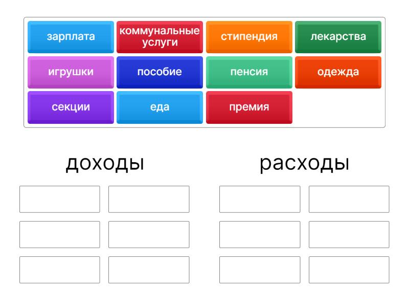 доходы : стипендия , зарплата, пенсия, пособие , премия , расходы: игрушки , коммунальные услуги , секции , еда , лекарства , одежда ,