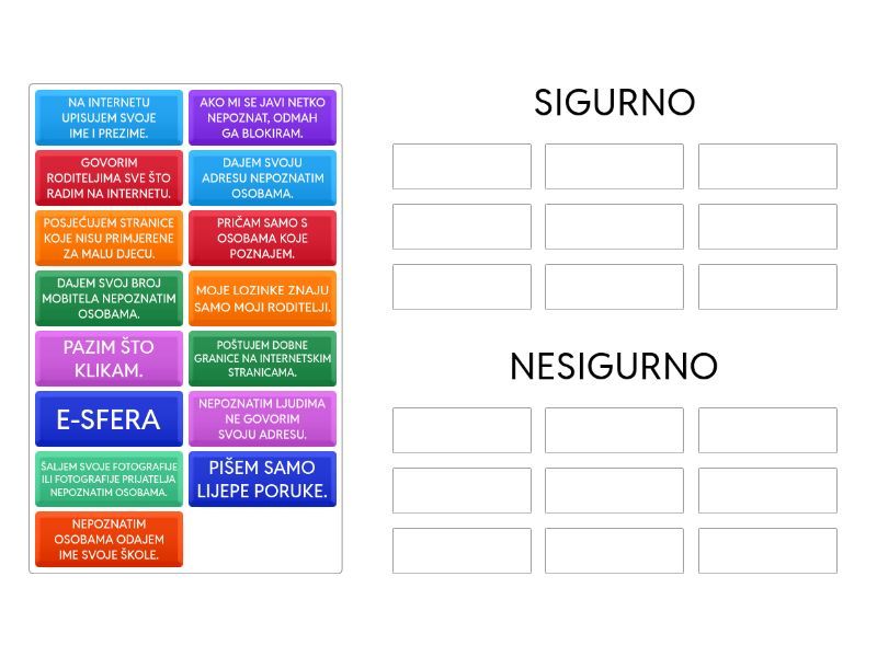 SIGURNO: E-SFERA, PRIČAM SAMO S OSOBAMA KOJE POZNAJEM., NEPOZNATIM LJUDIMA NE GOVORIM SVOJU ADRESU., PIŠEM SAMO LIJEPE PORUKE., MOJE LOZINKE ZNAJU SAMO MOJI RODITELJI., AKO MI SE JAVI NETKO NEPOZNAT, ODMAH GA BLOKIRAM., PAZIM ŠTO KLIKAM., GOVORIM RODITELJIMA SVE ŠTO RADIM NA INTERNETU., POŠTUJEM DOBNE GRANICE NA INTERNETSKIM STRANICAMA., NESIGURNO: POSJEĆUJEM STRANICE KOJE NISU PRIMJERENE ZA MALU DJECU., NA INTERNETU UPISUJEM SVOJE IME I PREZIME., DAJEM SVOJU ADRESU NEPOZNATIM OSOBAMA., DAJEM SVOJ BROJ MOBITELA NEPOZNATIM OSOBAMA., NEPOZNATIM OSOBAMA ODAJEM IME SVOJE ŠKOLE., ŠALJEM SVOJE FOTOGRAFIJE ILI FOTOGRAFIJE PRIJATELJA NEPOZNATIM OSOBAMA.,