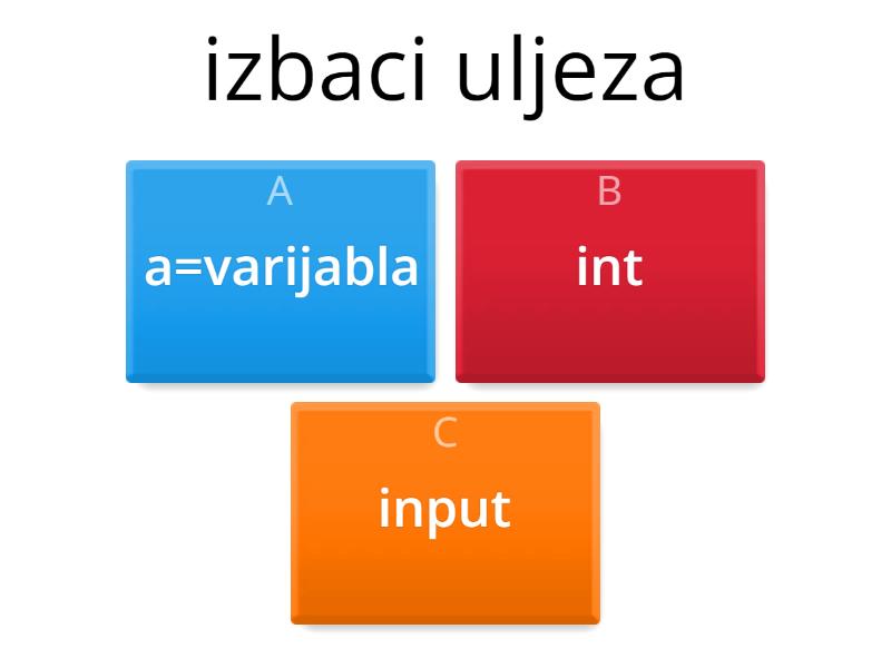 1) izbaci uljeza a) a=varijabla b) int c) input 2) Koji je operator za ostatak  dijeljenja? a) * b) + c) - d) # e) ( f) % 3) Što znači naredba print()? a) ispis b) ulaz c) obrada 4) Označi varijable: a) a= b) print c) int 5) Kako glasi naredba za otvaranje programa za crtanje? a) from cow import+ b) from turtle import c) from turtle iport d) from turtle import* e) nema točnog odgovor 6) Kojom naredbom imenujemo prozor za crtanje? a) st() b) pd() c) pu() d) title() 7) Izbaci uljeza: a) print() b) fd() c) lt() d) bk() e) rt() 8) Kako se kornjača pomiće u naprijed? a) sa() b) fd() c) omg() 9) Kako se briše crtež u grafičkom zaslonu? a) undo() b) penup() c) clear() 10) Sviđa li vam se kviz? a) možda b) daaaaaaaaa!!!!!!!!!!!!! c) ne  d) užas e) dobar f) odlično