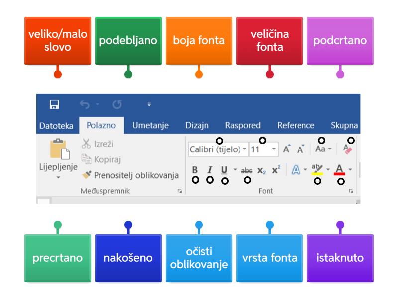 vrsta fonta, veličina fonta, boja fonta, podebljano, podcrtano, nakošeno, precrtano, veliko/malo slovo, istaknuto, očisti oblikovanje.
