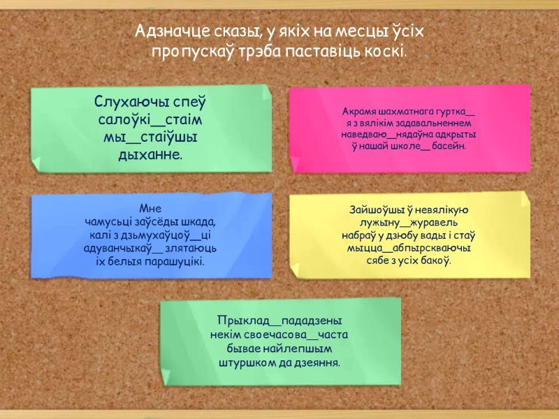 1) Адзначце сказы, у якіх на месцы пропуску трэба паставіць знак прыпынку. a) У сваёй гаспадарцы я сам часта бываю __ замест цесляра. b) Першакласнік спяшаецца ў школу, першакурснік __ цвёрда ступаючы __ крочыць ва ўніверсітэт. c) Зверабой __ ці інакш святаяннік __ з'яўляецца лекавай раслінай. d) Чакаю заўжды сустрэчы з Маргвой __ прыгожай рэчкай светлага дзяцінства. e) Лепш за ўсё ў Ляўках восенню, калі чаруе звон __ кранутых золатам __ лясоў. 2) Адзначце сказы, у якіх на месцы пропуску трэба паставіць коску. a) Незвычайна прыгожыя летнія росы, што на ранішніх травах зіхацяць _ пераліваючыся. b) Зарослыя маліннікам __ лесасекі нярэдка сустракаюцца ў лісцевых лясах. c) Узяўшы свой посах __ мяняла фарбы восень. d) Арэлі __ або інакш гушкалка __ ніколі ў нашым двары не пустуюць. e) Выдатнаму этнографу і фалькларысту Аляксандру Сержпутоўскаму __ акрамя двух зборнікаў беларускіх казак __ належаць зборнік замоў і легенд, зборнік беларускіх прымавак. 3) Адзначце сказы, у якіх на месцы пропуску трэба паставіць коску. a) Снег__схоплены марозікам__дзіўна рыпіць пад нагамі. b) Дбаючы разам з векам аб касмічным цудзе__ памятай, што чалавекам ніхто за цябе не будзе. c) Сядзець__склаўшы рукі__ не ў характары беларуса. d) Вялікі славянскі паэт __ Адам Міцкевіч нарадзіўся ў фальварку Завоссе на Навагрудчыне. e) Пад нагамі __ астываючы__ кладзецца асенняга лісця плаўленая медзь. 4) Адзначце сказы, у якіх на месцы пропуску трэба паставіць коску. a) Усе дрэвы__акрамя елак і сосен__апранулі залатое ўбранне. b) Пасоленыя ў дубовых бочках __грузды былі абавязковай стравай на бабуліным стале. c) Першы раз у свой першы клас кожны ідзе__хвалюючыся. d) Адплыўшы ў небыццё__засталіся назаўсёды ва ўспамінах вясковыя вячоркі. e) Чорны дзяцел__або жаўна__ праводзяць усё жыццё на ствалах дрэў ці ў дупле. 5) Адзначце сказы, у якіх на месцы ўсіх пропускаў трэба паставіць коскі. a) Штогод у сваім садзе мы з татам адкрываем__развешваючы кармушкі__сталовую для птушак. b) Мнаганожка__ці папараць салодкая__можа расці на ствалах паваленых дрэў і на валунах. c) Апрача баравікоў__ сушаць у нас падбярозавікі і махавікі. d) У пачатку лістапада сонца яшчэ імкнулася адагрэць __ схопленую першым марозікам__ зямлю. e) Плывуць камбайны-караблі па моры жытнёвым __не спяшаючыся. 6) Адзначце сказы, у якіх на месцы ўсіх пропускаў трэба паставіць коскі. a) Слухаючы спеў салоўкі__стаім мы__стаіўшы дыханне. b) Акрамя шахматнага гуртка__ я з вялікім задавальненнем наведваю__нядаўна адкрыты ў нашай школе__ басейн. c) Мне чамусьці заўсёды шкада, калі з дзьмухаўцоў__ці адуванчыкаў__ злятаюць іх белыя парашуцікі. d) Зайшоўшы ў невялікую лужыну__журавель набраў у дзюбу вады і стаў мыцца__абпырскваючы сябе з усіх бакоў. e) Прыклад__пададзены некім своечасова__часта бывае найлепшым штуршком да дзеяння. 7) Адзначце сказы, у якіх на месцы пропуску трэба паставіць знак прыпынку. a) Апранутая ў чорную світку__варона ўважліва сачыла за мітуслівымі вераб'ямі. b) Вясна па лугах і па лясах ішла__спяшаючыся. c) Не спыняючыся ні на хвіліну__цячэ вяртлявая рачулка. d) Зіхаціць на сонцы чароўная Нарач__люстра светлае краю майго. e) Нягледзячы на позні час__ каля ружовай канюшыны нястомна кружаць матылькі. 8) Адзначце сказы, у якіх прапушчаны знак прыпынку. a) З Мірскім замкам нашым неацэнным скарбам звязана шмат слаўных старонак гісторыі. b) Падымаючы ігліцу растуць на радасць грыбнікам д