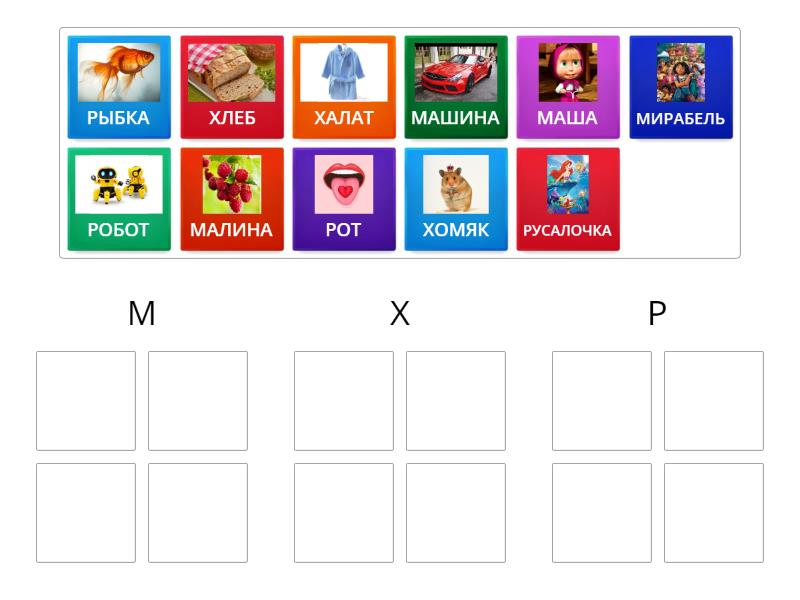 М: МАШИНА, МАША, МАЛИНА, МИРАБЕЛЬ, Х: ХЛЕБ, ХОМЯК, ХАЛАТ, Р: РЫБКА, РУСАЛОЧКА, РОБОТ, РОТ,
