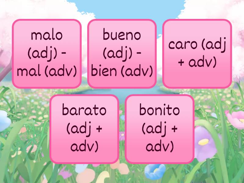 bueno (adj) - bien (adv) - хоро́ший (adj) - хорошо́ (adv), malo (adj) - mal (adv) - плохо́й (adj) - пло́хо (adv), bonito (adj + adv) - краси́вый (adj) - краси́во (adv), caro (adj + adv) - дорого́й (adj) - до́рого (adv), barato (adj + adv) - дешёвый (adj) - дёшево (adj),