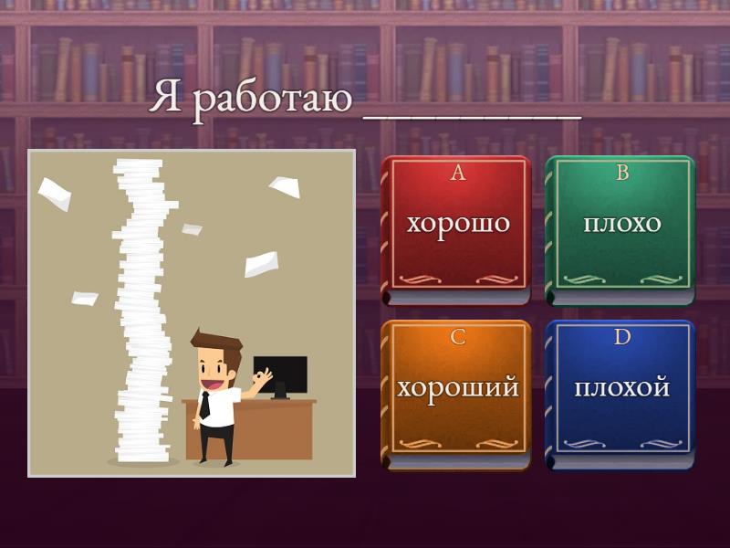 1) Я работаю _________ a) хорошо b) плохо c) хороший d) плохой 2) Я работаю _________  a) хорошо b) плохо c) хороший d) плохой 3) Этот человек _________  a) хорошо b) плохо c) хороший d) плохой 4) Этот человек _________  a) хорошо b) плохо c) хороший d) плохой 5) Мой обед _________  a) хорошо b) плохо c) хороший d) плохой 6) Этот день _________  a) хорошо b) плохо c) хороший d) плохой 7) Я вижу _________  a) хорошо b) плохо c) хороший d) плохой 8) Я пишу _________  a) хорошо b) плохо c) хороший d) плохой 9) Этот автомобиль _________  a) дорого b) дорогой 10) Этот автомобиль стоит _________  a) дорого b) дорогой 11) Этот рисунок _________  a) красиво b) красивый 12) Я рисую _________  a) красиво b) красивый 13) Этот фрукт _________  a) дешево b) дешевый 14) Я покупаю _________  a) дешево b) дешевый