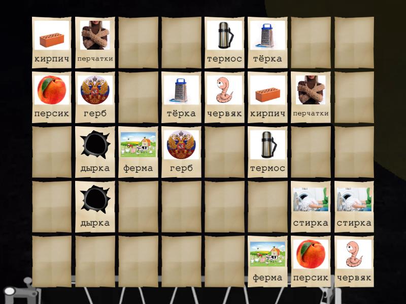 дырка, стирка, кирпич, герб, ферма, персик, термос, червяк, перчатки, тёрка, сердце, пятёрка, ёрш, доярка, чёрный, верх, серпантин, баржа, шорты, горка,