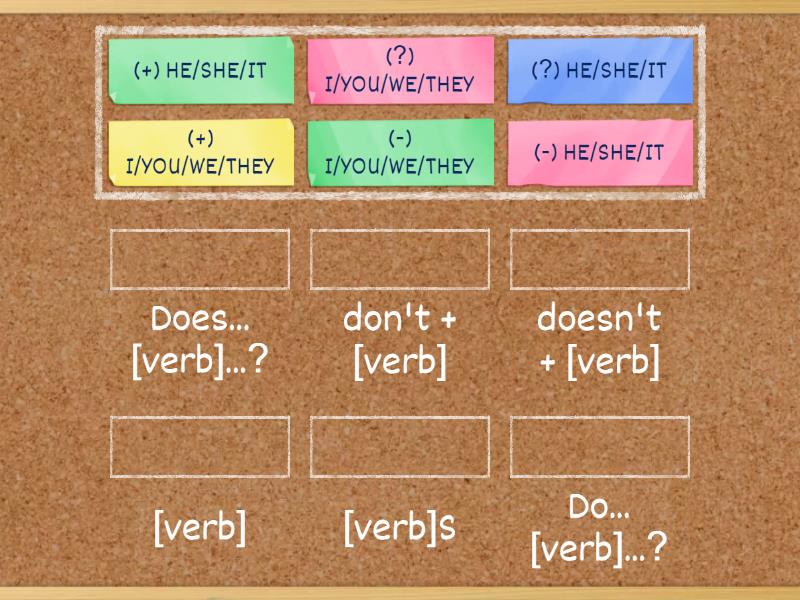 (+) I/YOU/WE/THEY - [verb], (+) HE/SHE/IT - [verb]S, (-) I/YOU/WE/THEY - don't + [verb] , (-) HE/SHE/IT - doesn't + [verb], (?) I/YOU/WE/THEY - Do... [verb]...?, (?) HE/SHE/IT - Does... [verb]...?,