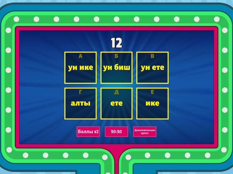 1) 12 a) ун ике b) ун биш c) ун ете d) алты e) ете f) ике 2) 20 a) ете b) ике c) егерме d) ун e) алты f) ноль 3) 75 a) етмеш биш b) алтмыш биш c) етмеш ике d) биш етмеш e) һикһән ете f) йөҙ 4) 126 a) егерме алты b) Йөҙ ҙә илле алты c) йөҙ егерме һигеҙ d) Йөҙ ҙә егерме алты e) Йөҙ алты f) етмеш биш 5) Ике мең алты йөҙ ҙә илле һигеҙ a) 2685 b) 4562 c) 3658 d) 2658 e) 2659 f) 7658 6) Туҡһан биш a) 65 b) 75 c) 95 d) 105 e) 85 f) 45 7) 153 a) йөҙ ҙә илле ете b) йөҙ ҙә етмеш биш c) йөҙ ҙә илле өс d) йөҙ ҙә һикһән бер e) ике йөҙ ҙә алтмыш өс f) илле өс 8) 2000 a) ике йөҙ b) егерме c) ике d) егерме мең e) ике мең f) ике йөҙ мең 9) һигеҙ a) 6 b) 5 c) 8 d) 10 e) 9 f) 7 10) Ун мең алты йөҙ ҙә етмеш ике a) две тысячи двадцать восемь b) десять тысяч шестьсот семьдесят два c) десять тысяч семьсот  d) десять тысяч семьсот e) двадцать тысяч восемьсот два f) девятьсот двадцать два