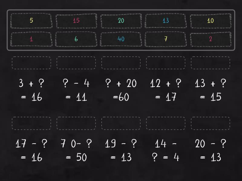 10 - 14 - ? = 4, 6 - 19 - ? = 13, 1 - 17 - ? = 16, 2 - 13 + ? = 15, 7 - 20 - ? = 13, 13 - 3 + ? = 16, 15 - ? - 4 = 11, 5 - 12 + ? = 17, 40 - ? + 20 =60, 20 - 7 0- ? = 50,