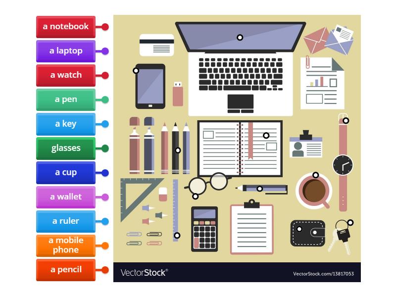 a key, a watch, a mobile phone, glasses, a wallet, a cup, a pen, a pencil, a laptop, a ruler, a notebook.