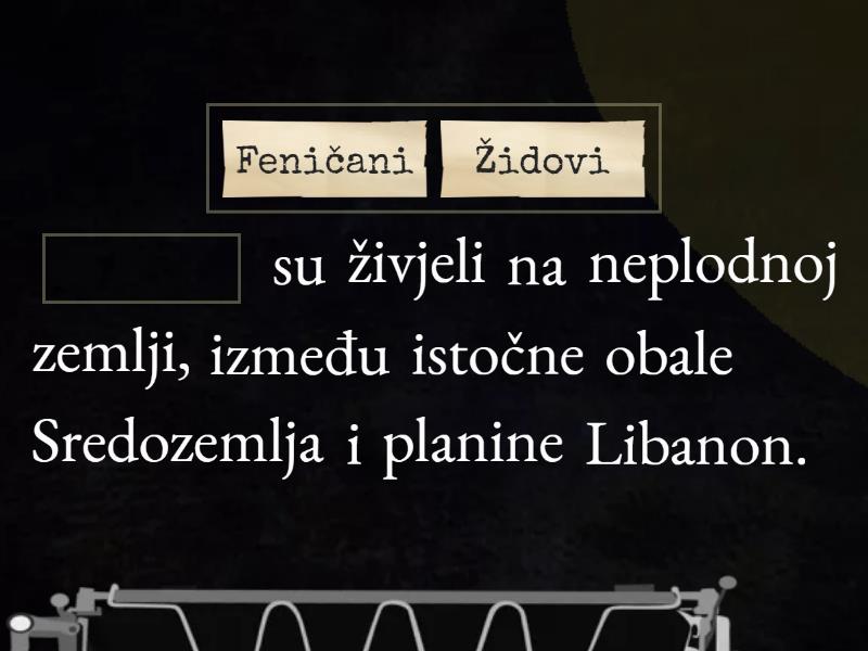 ____ su živjeli na neplodnoj zemlji, između istočne obale Sredozemlja i planine Libanon. U feničkoj državi trgovalo se drvom koje se zove ____. Feničani su otkrili i ____ boju. Feničani su gradili i kvalitetne brodove kojima su plovili po Sredozemlju pa možemo reći kako su bili i vješti ____. Feničani su izumili i prvo ____ pismo u povijesti. ____ je bila najpoznatija fenička kolonija. ____ su bili prvi narod u povijesti koji počinje vjerovati u ____ boga. ____ je Židovima dao ____ (napiši slovima!) božjih zapovijedi ____ država je bila najjača u vrijeme vladara Darija. Darije je podijelio Perziju na manje dijelove koji su se zvali ____. Satrapijama su upravljali ____. Perzijska država je imala dobro organiziranu ____ ____ kojom se koristio samo kralj.