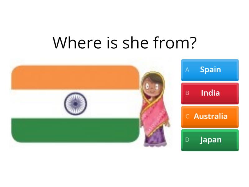 1) Where is she from? a) Spain b) India c) Australia d) Japan 2) Where is he form? a) the USA b) Australia c) Japan d) the UK 3) Are they from the UK? a) Yes, they are. b) No, they aren't. They're from Australia. c) No, they aren't. They 're from Spain. d) Yes, she is from Australia. 4) Is Jimmy from Singapore? a) No, he isn't. He is form Japan. b) Yes, he is from Taiwan. c) Yes he is. d) Yes, he is from Spain. 5) Is Julia from India? a) No, she isn't. She is from Spain. b) Yes, she is from India. c) No, she is from Taiwan. d) No, she isn't. She is from Japan. 6) Is Jenny from Australia? a) No, she isn't. She is from the USA. b) Yes, she is from Australia. c) No, she isn't. She is from the UK. d) Yes, she is from Singapore.