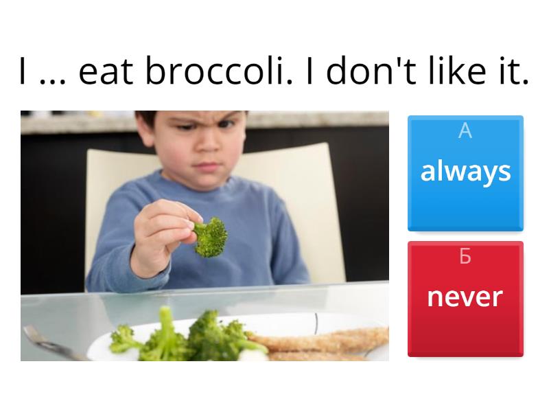 1) I ... eat broccoli. I don't like it. a) always b) never 2) She ... up at 6 o'clock. a) get b) go c) gets d) goes 3) We ... dinner together. a) have b) take c) get d) listen 4) He ... ride a bike. a) can b) can't 5) It's ... a) half to ten b) half past ten c) half past nine d) quarter to ten 6) I don't like cooking, but ... I do it. a) sometimes b) never c) before d) after 7) ... is my favourite month because I love winter. a) March b) November c) July d) December 8) I usually ... my room after breakfast on Saturday. a) get b) can c) tidy d) before