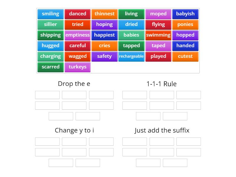 Drop the e: hoping, moped, smiling, taped, cutest, danced, charging, living, 1-1-1 Rule: swimming, hopped, shipping, tapped, hugged, thinnest, wagged, scarred, Change y to i: emptiness, happiest, cries, tried, ponies, sillier, babies, dried, Just add the suffix: flying, played, careful, safety, turkeys, rechargeable, babyish, handed,