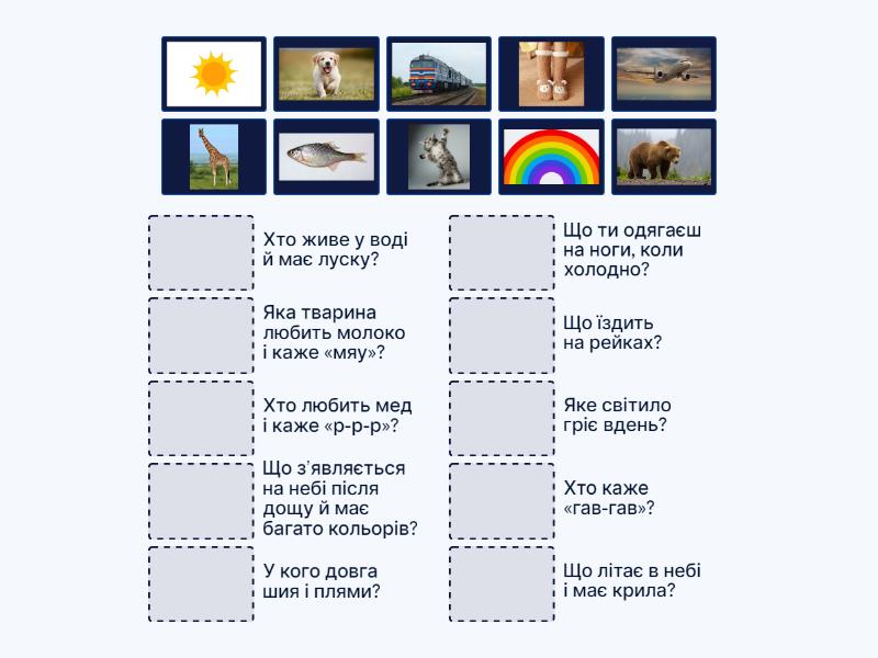 Що їздить на рейках?, Що літає в небі і має крила?, Яке світило гріє вдень?, У кого довга шия і плями?, Яка тварина любить молоко і каже «мяу»?, Хто каже «гав-гав»?, Хто живе у воді й має луску?, Хто любить мед і каже «р-р-р»?, Що з’являється на небі після дощу й має багато кольорів?, Що ти одягаєш на ноги, коли холодно?,