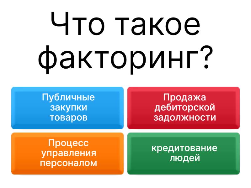 1) Что такое факторинг? a) Публичные закупки товаров  b) Продажа дебиторской задолжности c) Процесс управления персоналом d) кредитование людей  2) Основная цель использования факторинга в госзакупке? a) увелечение долгов компании b) обеспечение мгновенной ликвидности c) увеличение налоговых обязательств d) снижение цен на товары 3) Кто предоставляет услуги факторинга? a) Гос учреждения b) Факторинговые компании c) Налоговые органы d) Торговые ассоциации  4) Какой документ используется при заключении сделки факторинга? a) Договор купли-продажи b) договор факторинга  c) налоговая декларация  d) акт приемки- сдачи  5) Какой риск связан с использованием факторинга ? a) Риск чрезмерных налогов  b) риск невыполнения обязательств  c) риск повышения цен на товары  d) риск потери клиента