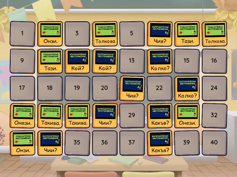 Кой?, Чии?, Чия?, Какъв?, Колко?, Онзи., Толкова., Тази., Такива., Онези., никой, никакъв, никакви, ничия, николко, който, каквато, колкото, чието, когото,